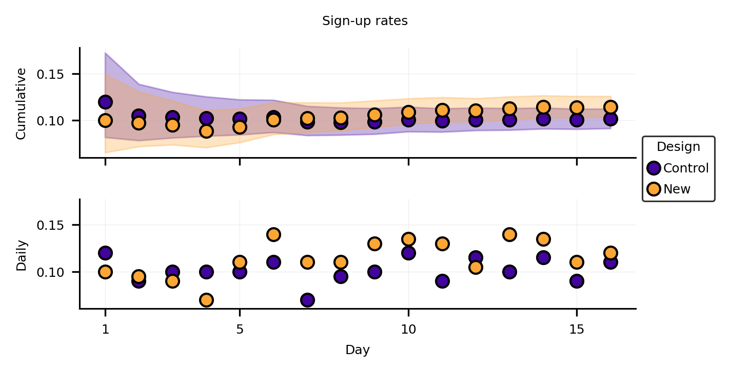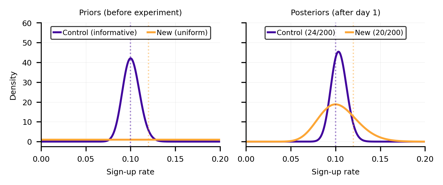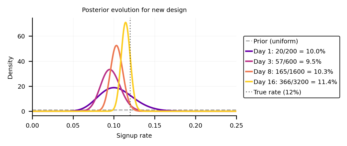 Expected loss drops below 0.1% around day 10 (Figure 4, right). This is the metric I find most compelling for real decisions. It tells you: “If you ship the new design right now and you’re wrong, you’ll lose less than 0.1% of sign-ups per visitor.” Is that worth six more days of experimentation? That depends on your traffic, your margins, and how unreasonably eager you are to ship fruit. But at least now you’re making a cost-aware decision, not just chasing a magic number.